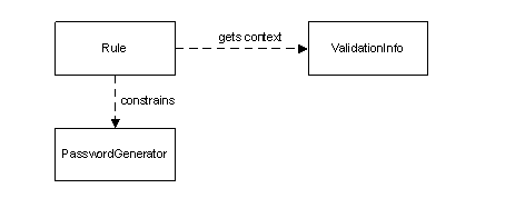 A Rule is also involved in the password generation process. The PasswordGenerator interface defines the requirements of the password generation engine. To override the generation algorithm of the platform, the client can provide an alternative implementation of this interface. At the time of password generation, the PasswordGenerator will be passed to each Rule instance in the framework as a visitor where the Rule can provide information to the PasswordGenerator to constrain the construction of the password being generated. For example, if a Rule defines a minimum of 6 characters is required for a password; this information is provided to the PasswordGenerator so that it does not generate a password with under 6 characters. Please see the accompanying API Reference Document for more details on the individual objects.